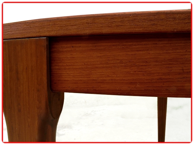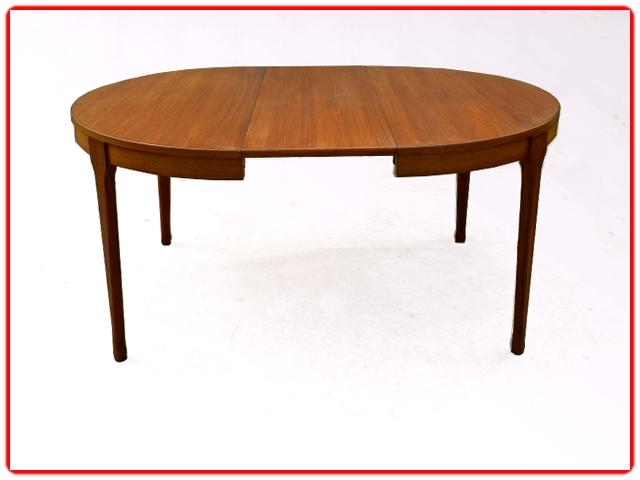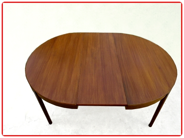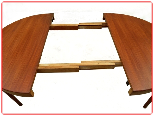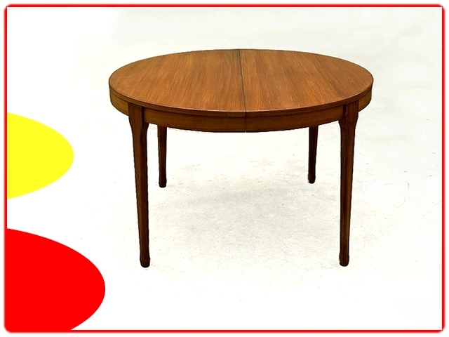 Table scandinave en teck distribuée par Meubles tv Paris dans les années 1960. Designer non identifié. Table ronde extensible, par une rallonge, pouvant accueillir confortablement 6 personnes, passant d’un diamètre de 120 cm à un ovale de 160 cm. Très joli veinage du placage, piètement fuselé en bois massif démontable.