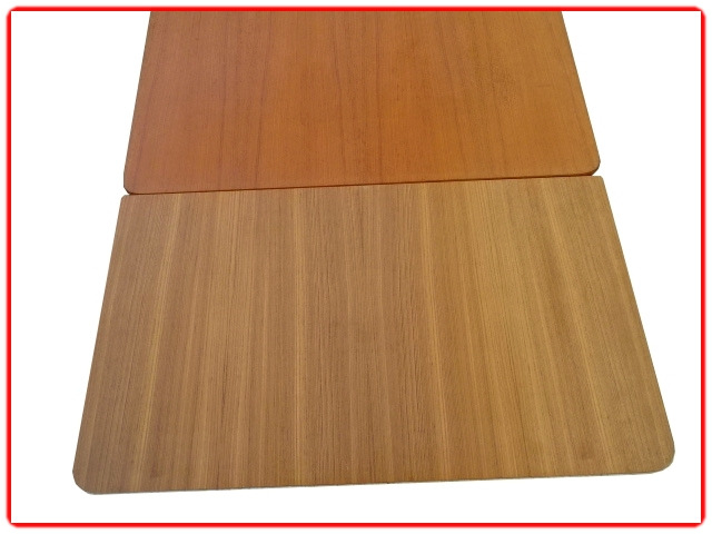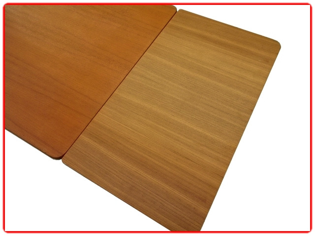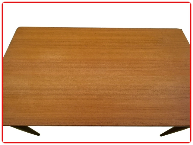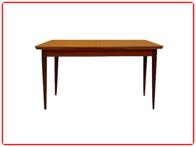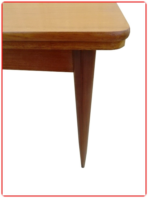 Table de salle à manger avec 2 rallonges intégrées dîtes à l’italienne. Pieds fuselés démontables. Table de belle fabrication française en teck design scandinave.