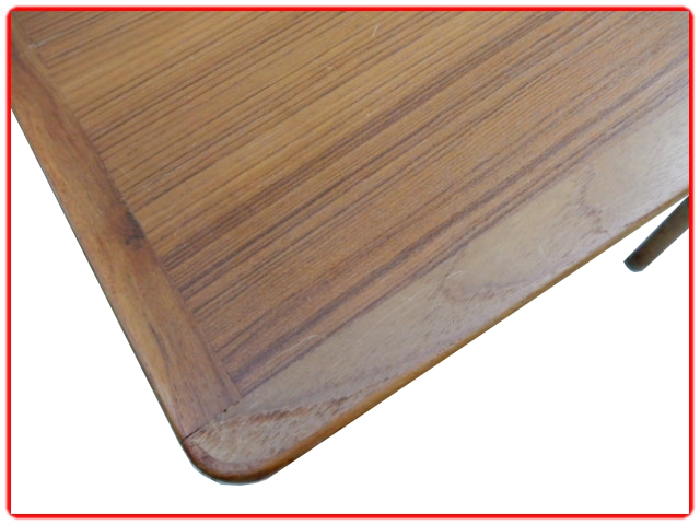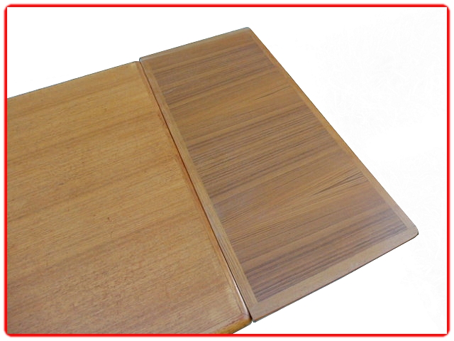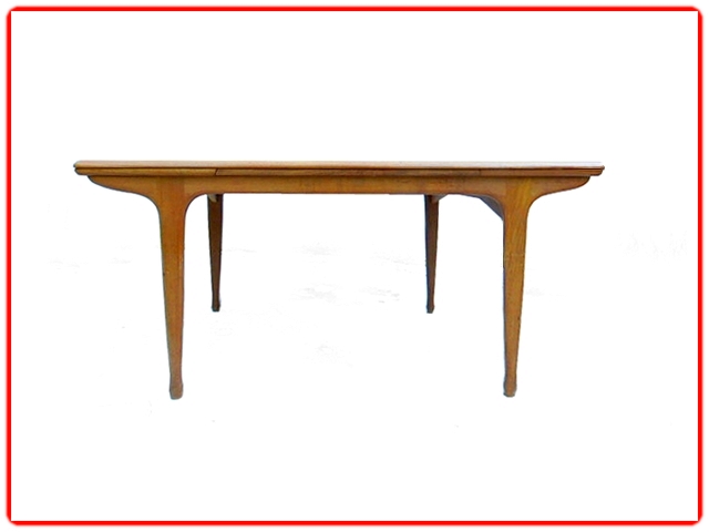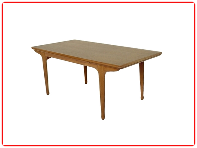 Table de repas des années 1960 en teck clair éditée par Tricoire & Vecchione Meubles TV Paris. A chaque extrémité une rallonge coulissante intégrée, bords arrondis, pieds démontables fuselés. Fabrication de qualité beau veinage du teck et belles finitions. Estampillée.