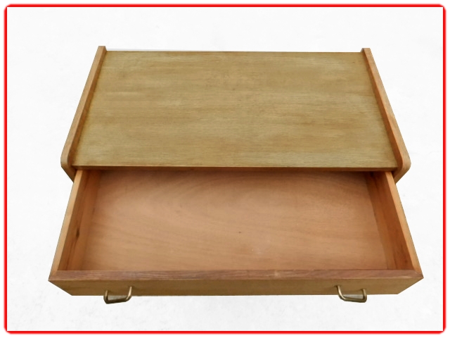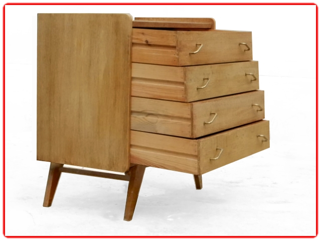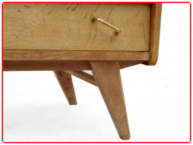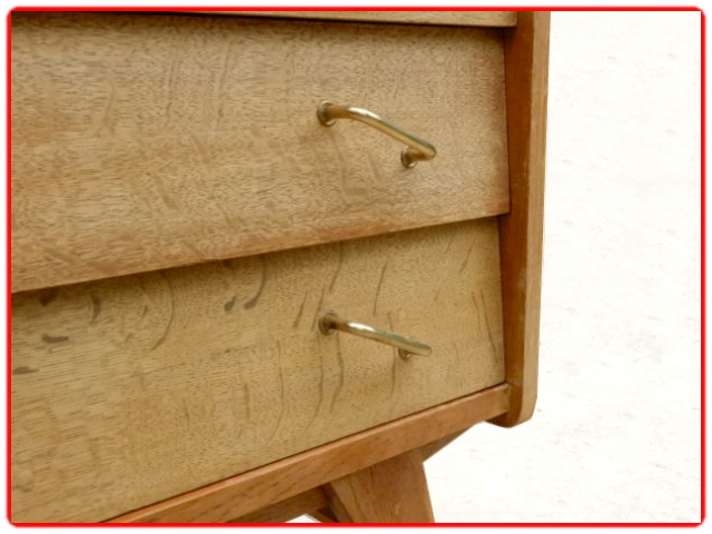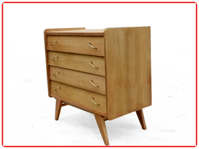 Commode vintage des années 1950 en bois massif et bois contreplaqué. Sans aggloméré, adaptable en meuble de salle de bains sous vasque. Les angles sont arrondis, les tiroirs avec poignées en laiton doré sont inclinés et les 4 pieds compas. Pour une déco tendance.Commode en très bel état entièrement remise à neuf, ni tache ni auréole, pas de manque, les tiroirs coulissent parfaitement sans accrocher, bien stable, pieds renforcés.