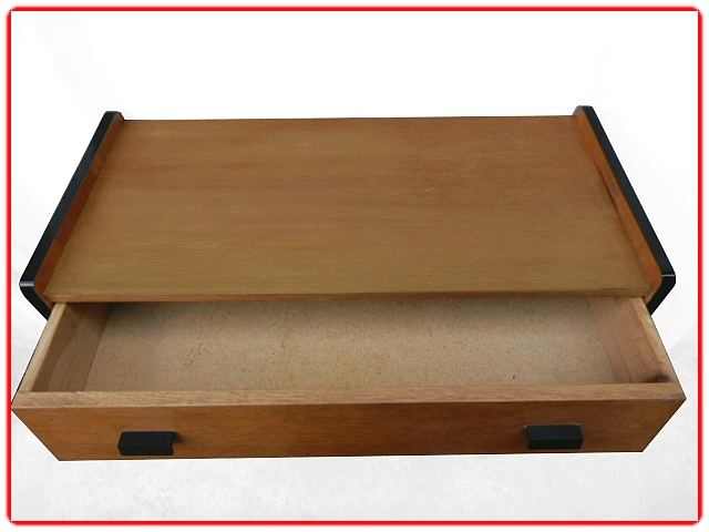 Jolie teinte chaude chêne doré, les tiroirs inclinés sont munis de poignées en bakélite noire. Commode légèrement relookée, les chants de côtés ont été remplacés par des chants noirs pour rappel avec les poignées.