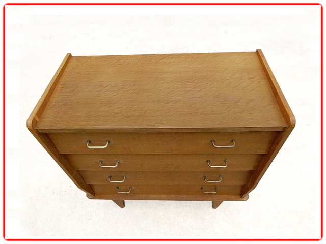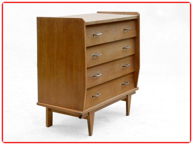 Commode vintage des années 1950 en bois clair doré. Composée de 4 tiroirs inclinés avec poignées dorées … Lire la suite