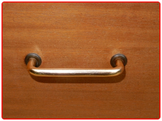 Commode vintage des années 1960 en bois et placage sur bois. Modèle adaptable en commode sous vasque pour salle de bains. Composée de 4 tiroirs inclinés avec poignée d’origine en métal dorée, piètement à pieds fuselés inclinés. Commode atypique avec ses côtés légèrement plus larges en bas, couleur chaude, angles arrondis procurant beaucoup de douceur, parfaite pour une chambre d’enfant.
