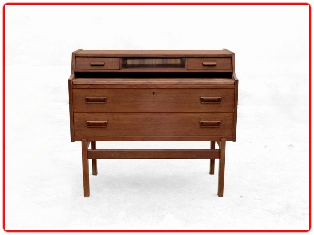 Commode danoise évolutive, coiffeuse secrétaire en teck du designer Arne Wahl Iversen pour Vinde Møbelfabrik datant des années 1960. Composée de 2 grands tiroirs, écritoire coulissant, 2 petits tiroirs encadrant le miroir central escamotable. Commode coiffeuse scandinave estampillée très rarement proposée avec le miroir. Le miroir peut être démonté pour utiliser l’espace en rangement papiers par exemple. Belles finitions.