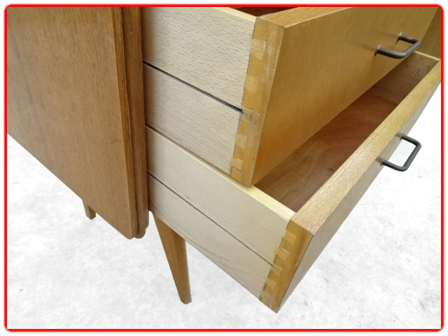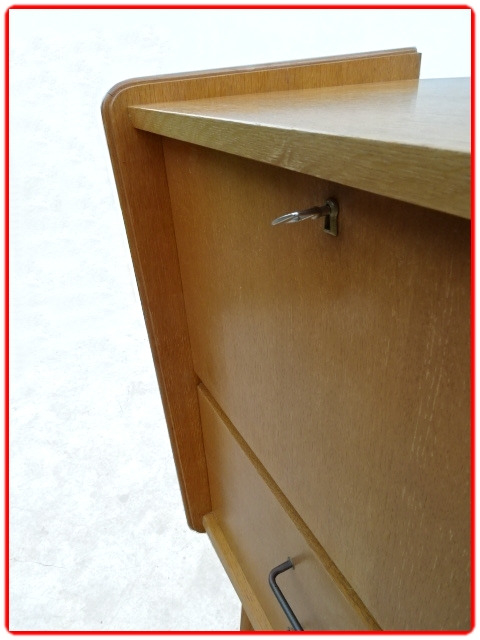 Buffet vintage des éditions SAM Société d’Ameublement Moderne, Demi-siècle, estampillé, en bois massif et placage sur bois latté. Sans aggloméré il peut être adapté en meuble de salle de bains sous vasque. Ouvre par un bar, avec serrure, sur une étagère amovible, 2 tiroirs avec poignée laiton, porte avec serrure découvrant une étagère réglable sur 3 niveaux. Longs pieds compas de 39 cm inclinés vers l’avant, abattant recouvert d’un vinyle vert. Meuble de rangement en mini enfilade de qualité en chêne clair des années 1950, entièrement démontable, pour une décoration vintage tendance.