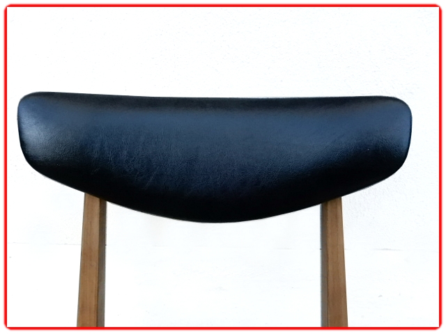 4 chaises vintage anciennes des années 1960 design scandinave en hêtre clair et skaï noir. Chaises entièrement rénovées. Le bois a été poncé et reverni de 3 couches de vernis aspect ciré. Les assises sont souples et confortables, sur sangles + ouate + mousse, habillées de skaï noir neuf. Les dossiers rembourrés de mousse sont d’origine, le skaï noir est en très bon état légèrement différent de celui des assises neuf. Vous pourrez voir la réfection de ces sièges ici –> atelier-vie-anterieure-79/#scandinave