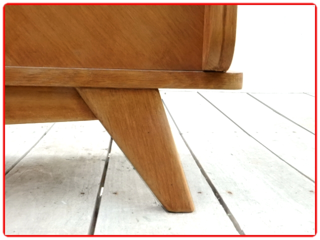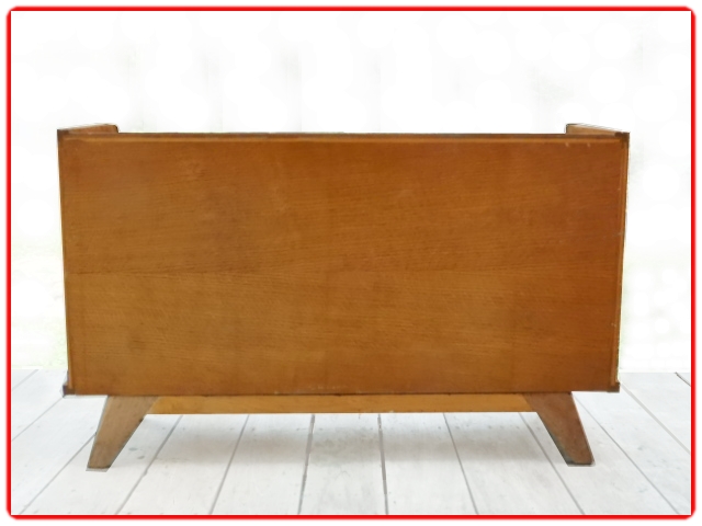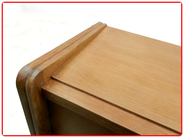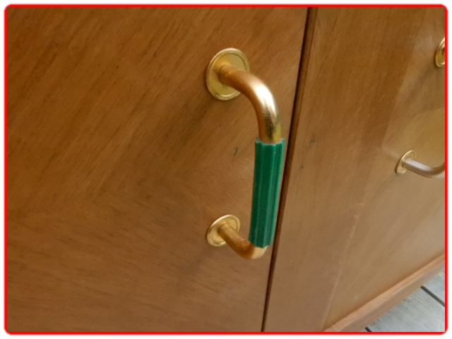 Buffet bas étroit vintage des années 1950 en bois massif et placage sur bois contreplaqué. Ouvre par 2 portes avec poignées en métal doré et bakélite …