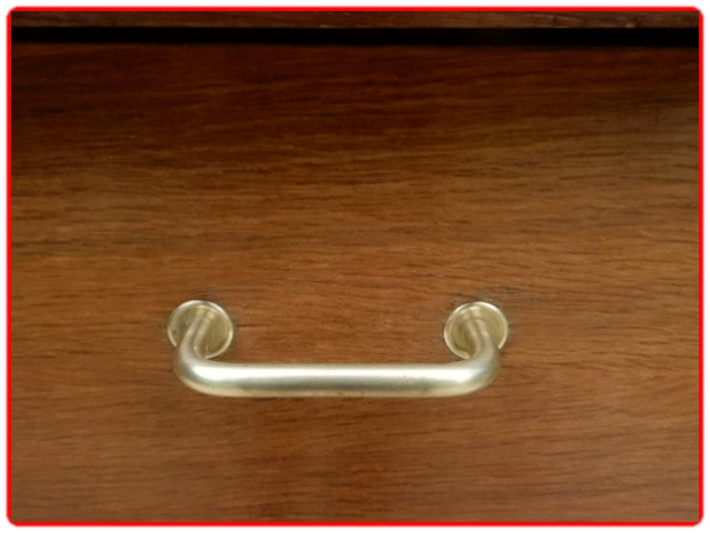 Commode vintage des années 1950 en bois massif et bois contreplaqué. Les 4 tiroirs inclinés sont munis de poignées en laiton doré, le caisson repose sur 4 pieds compas. Commode au profil très légèrement incliné qui peut s’adapter en meuble de salle de bains sous vasque. Teinte chaude chêne moyen.