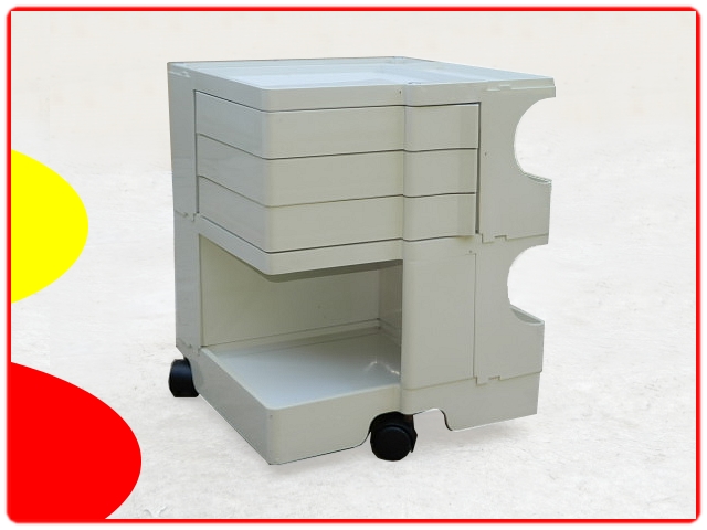 Desserte Boby de Joe Colombo éditée par Bieffeplast dans les années 1970. Rangements multiples, 3 tiroirs pivotants sur un côté et 3 compartiments ouverts. Ingénieux, ce modèle est surmonté d’une tablette qui permet de ranger les accessoires en plus d’un rangement vertical fermé. Fabrication en plastique blanc, desserte sur 3 roulettes. Signée « Joe Colombo ».