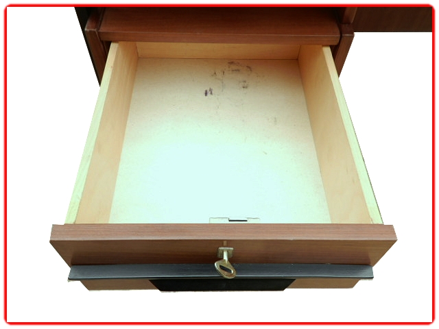 Bureau bien préservé, à noter la marque d’un sous-main sur le plateau. Bien stable, les tiroirs coulissent parfaitement. Fourni avec la clé d’origine, la serrure fonctionne.