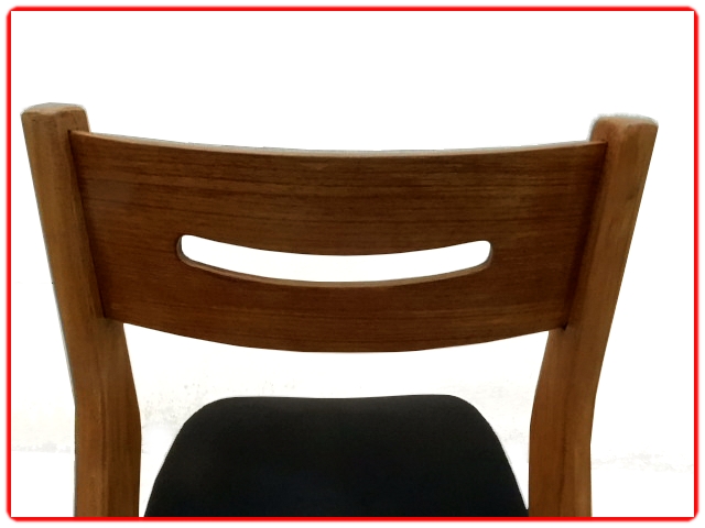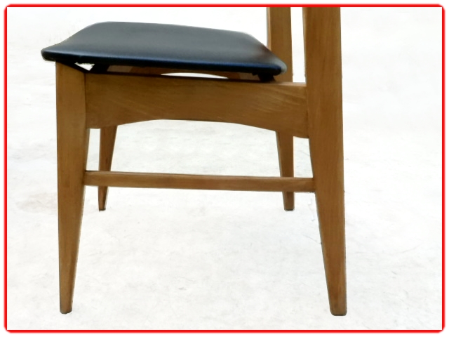 4 chaises vintage scandinave des années 1960 rénovées, bois poncé verni, skaï noir neuf. Des chaises sobres et élégantes au design épuré jouant sur les matières et les teintes, avec dossier en teck et piètement en hêtre.