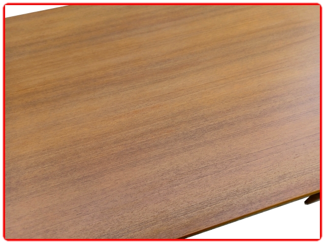 Table de repas vintage scandinave en teck des années 1960. Ligne aérienne inspirée du design scandinave, extensible par 2 rallonges latérales coulissantes sous le plateau. Les rallonges, munies d’une poignée noire, coulissent parfaitement et permettent de recevoir confortablement jusqu’à 8 couverts. Angles du plateau et des rallonges arrondis. Les pieds sont coniques et démontables.