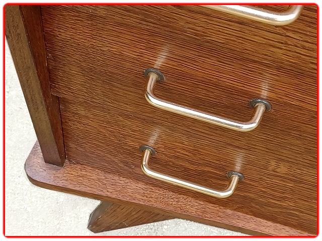 Commode vintage des années 1960 en bois teinte chêne moyen composée de 4 tiroirs avec façades inclinées et poignées d’origine en métal doré. Le caisson repose sur 4 longs pieds compas qui donnent légèreté et élégance à ce joli modèle.