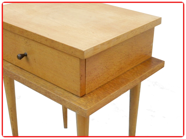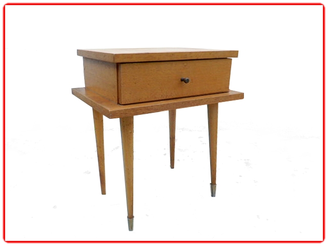 Table de chevet vintage des années 1960 en bois clair. Composée d’un tiroir, avec bouton en métal, qui repose sur 4 longs pieds coniques démontables. A la tête de votre lit et aussi à usage de bout de canapé pour une déco tendance.