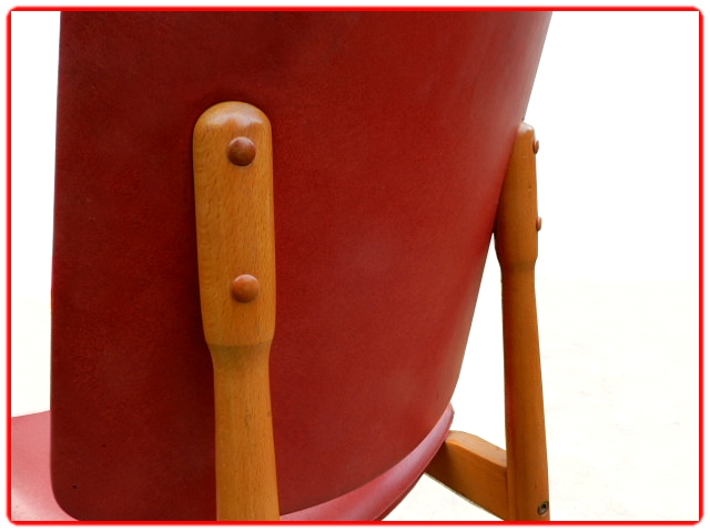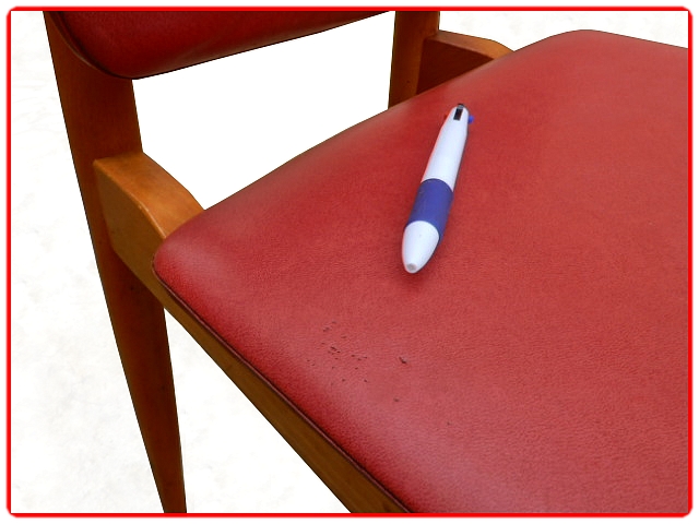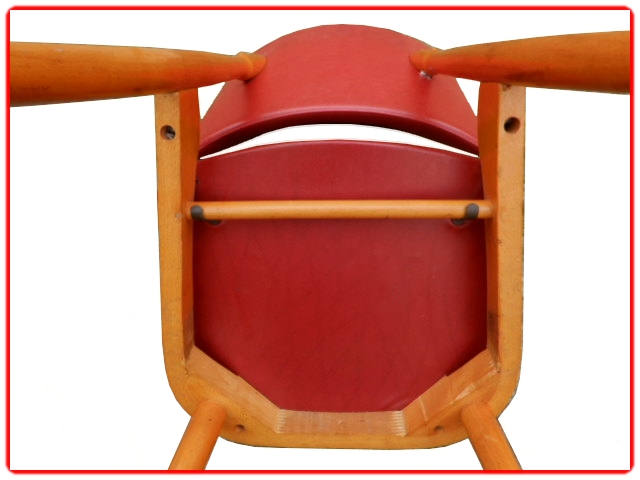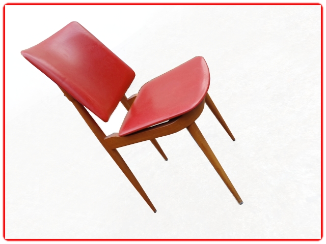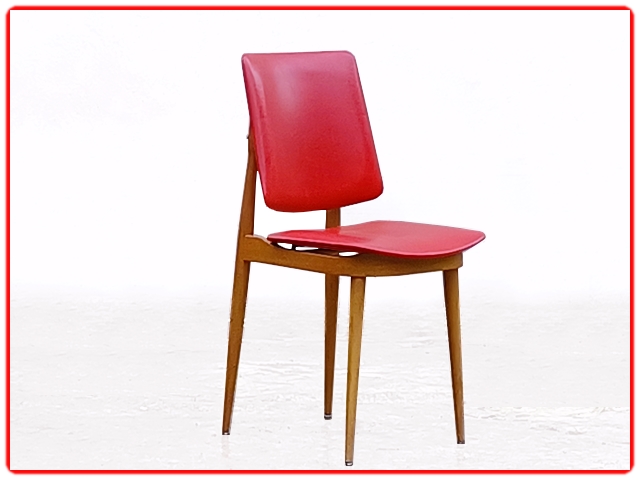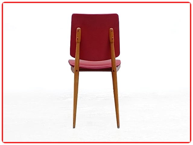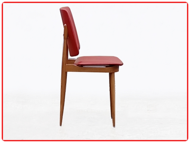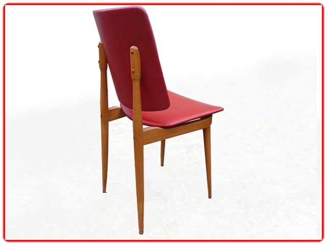 Ensemble de 4 chaises Nadia par Baumann, dans les années 1960. Structure en hêtre massif, skaï d’origine rouge bien préservé. Juste sur une chaise micros piqûres. Modèle référencé chez Baumann Nadia 955, rare.