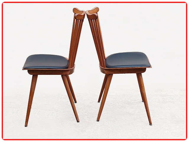 Paire de chaises Baumann modèle Sonate n° 842 des années 60. Chaise en hêtre clair avec dossier évasé à 7 barreaux et traverse haute en forme de moustache. L’assise en bois cintré est recouverte de skaï noir. Piètement évasé à pieds fuselés.