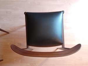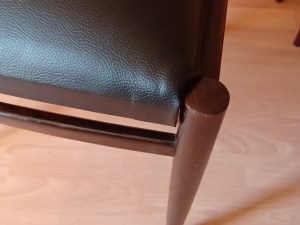 Ces chaises sont en bon état, bien entretenues et huilées, récemment retapissées de simili cuir noir, pas d’accroc comme neuf.
