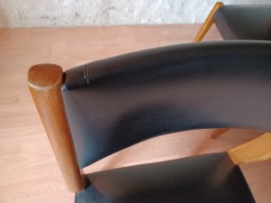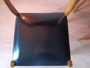 Chaises en bel état, traces mineures d’utilisation, mais bien entretenues. A noter une petite coupure sur un dossier voir gros plan dernière photo. Chaises pour table de repas de hauteur 72/73 cm.